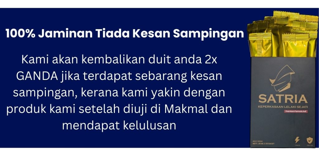 Ya, Jus Satria 100% daripada herba semula jadi dan tiada campuran bahan terlarang seperti sildenafil dan tadalafil. Telah diuji oleh makmal BIOCHEM(Penang) & disahkan bebas bahan merbahaya. Produk ini dihasilkan di kilang bertaraf GMP dan setiap batch diperiksa kualitinya untuk keselamatan pengguna.