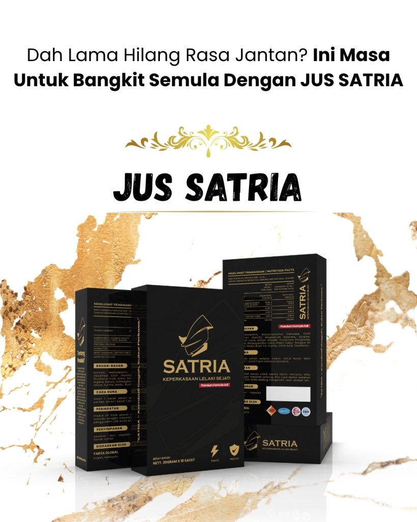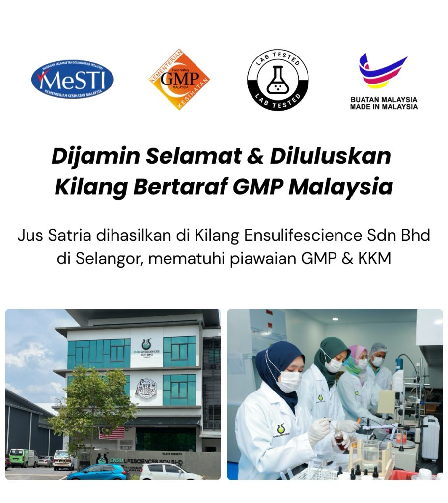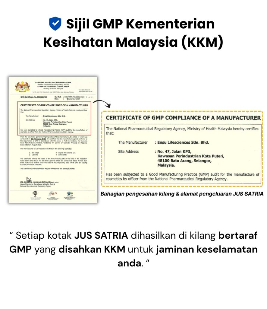 Ya, Jus Satria dihasilkan di kilang berstatus GMP yang disahkan oleh Kementerian Kesihatan Malaysia (KKM). Setiap kotak melalui proses kawalan kualiti ketat untuk memastikan ia selamat digunakan.